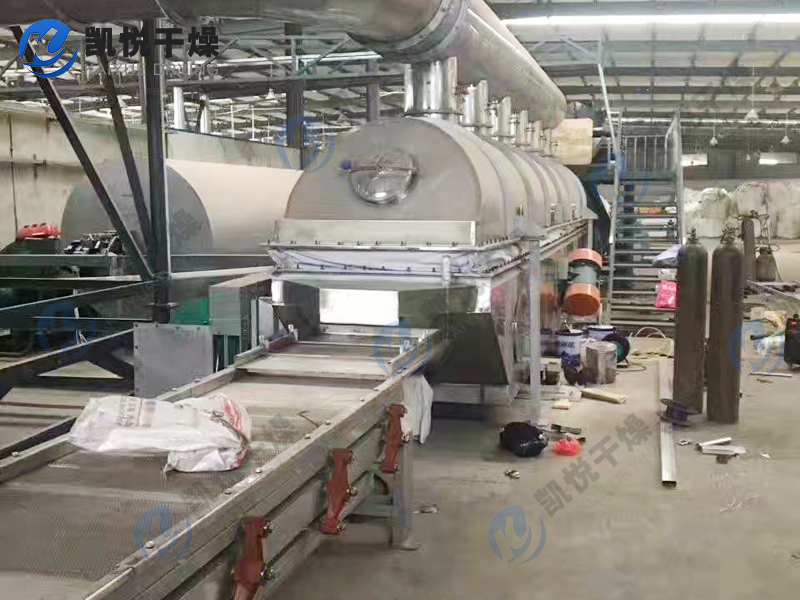 物料自进料进口进入机内,在振动力作用下,物料沿水平面流化床抛掷,向前连续运动,热风向上穿过流化床同湿物料换热后,湿空气经旋风分离器除尘后由排风1:3排出.干燥物料由排料进口排出。